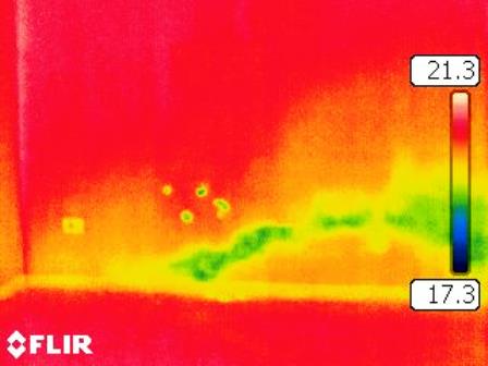 L'immagine termografica è relativa alla verifica della presenza di ponti termici e dispersioni di calore da un edificio realizzato una cinquantina di anni or sono. Le dispersioni termiche, provocate da un isolamento inadeguato, hanno causato la presenza di macchie di umidità all'interno dei locali.